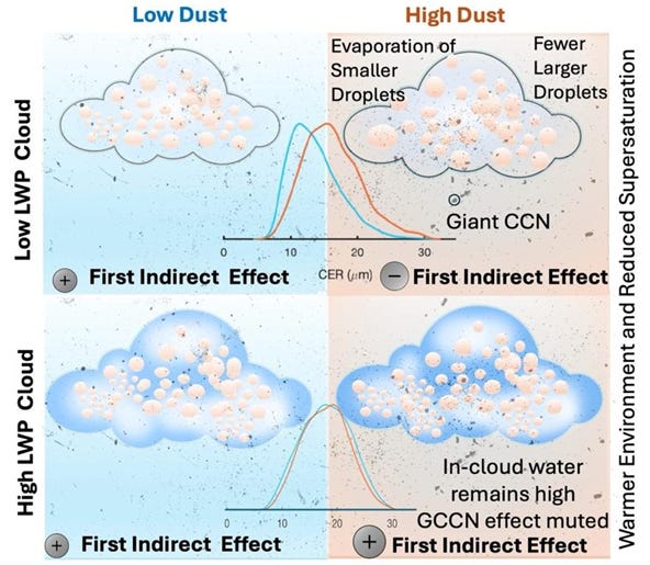 Synopsis: Mineral dust strongly alters aerosol–cloud interactions in warm marine clouds, but its role remains uncertain. Using satellite and reanalysis data (2003–2024), this study shows Saharan dust increases cloud effective radius by ~9% and weakens the first indirect effect by ~1.25×, even reversing its sign for thin clouds. Coarse dust acting as giant CCN and dust-driven radiative warming drive this response, yielding a net positive top-of-atmosphere forcing of 0.38 W m⁻².