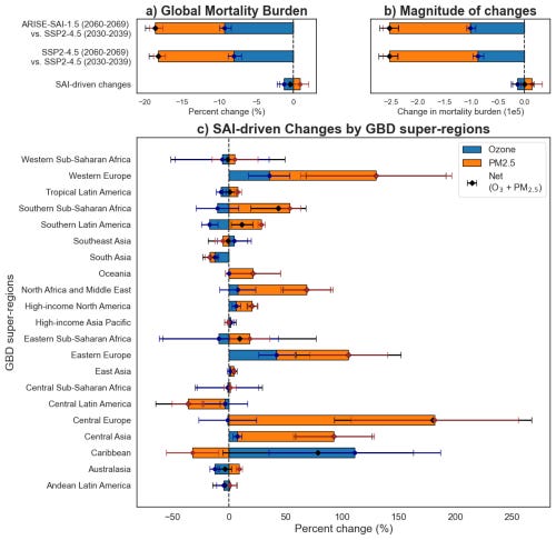 Synopsis: Using large CESM2-WACCM6 ensembles, this study evaluates public health impacts of Stratospheric Aerosol Injection (SAI) via changes in PM2.5 and surface ozone. Holding warming at 1.5 °C yields a small net global mortality reduction (~0.4%), with fewer ozone-related deaths but slightly higher PM2.5 mortality. Effects are modest, regionally uneven, sensitive to internal variability, and smaller than gains expected from near-term air quality policies.